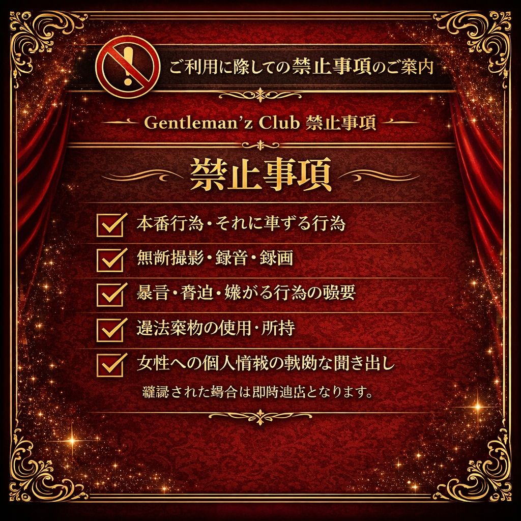 2026/02/15Gentleman’z Clubでは、すべてのお客様に安心して上質なお時間をお過ごしいただくため、以下の行為を固くお断りしております。ご理解とご協力をお願い申し上げます。■ 共通の禁止事項・本番行為、またはそれに準ずる行為・無断撮影・録音・録画等の行為・スタッフ・女性への暴言、威圧的言動、強要行為・泥酔状態でのご利用、または危険行為・薬物の使用・所持、違法行為全般・セクハラ行為、人格否定、職業差別的発言・キャストのプライベートを詮索する行為・本名・住所・連絡先等の個人情報を聞き出す行為・スカウト行為、引き抜きなどの行為■ デートコースご利用時の禁止事項・規定時間を超える無断延長行・女性が不安・危険を感じる場所への同行要求・密室空間・車内のみでの長時間拘束・アルコールの過度な強要・事前に取り決めのない内容の強要※デートコースは「紳士的な同伴」を前提としたサービスです禁止事項に該当した場合上記禁止事項が確認された場合、ご利用の途中であってもサービスを中止させていただく場合がございます。その際の返金には応じかねますので、予めご了承ください。